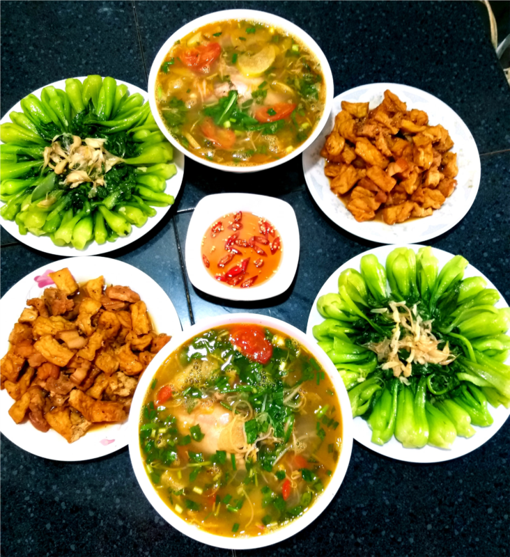 Cơm tẻ - Cá, thịt lợn đảo bông