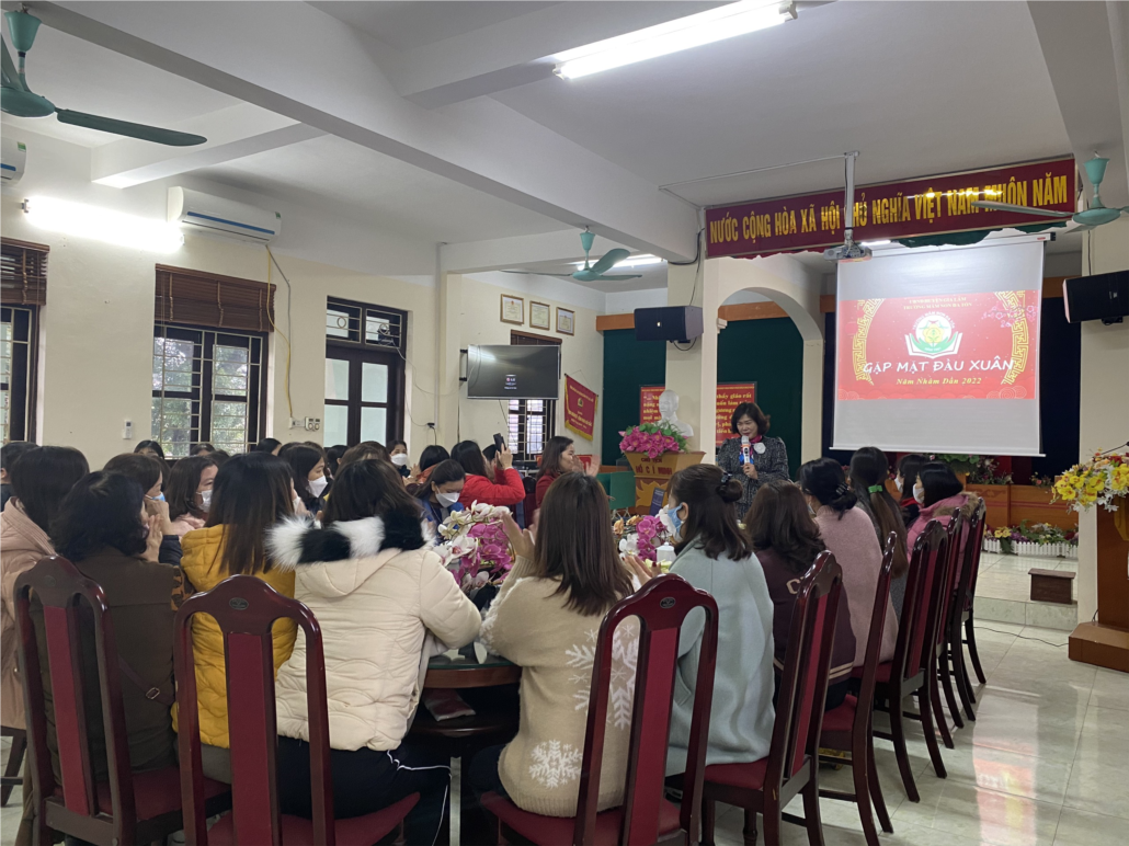 Dự buổi gặp mặt có đầy đủ các đồng chí CB-GV-NV nhà trường. Đ/c Nguyễn Thị Xuân Thanh -BTCB, Hiệu trưởng nhà trường đã phát biểu và động viên CB-GV-NV trong ngày gặp mặt đầu xuân. Đ/c Hiệu trưởng đã nhấn mạnh: Năm 2021, mặc dù tình hình dịch bệnh đã có diễn biến phức tạp, học sinh không đến trường, nhưng tập thể GV-NV nhà trường đã xây dựng video gửi PHHS giúp trẻ ôn luyện tại nhà một cách tốt nhất. Bên cạnh đó, công tác tổng vệ sinh cũng luôn được duy trì tốt. Các hội thi cũng được đông đảo giáo viên tham gia nhiệt tình, một số bài có chất lượng.